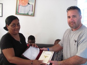 Deacon Micheal Dickens presents a memorial Bible to Elizabet, the widow of Rev. Jaime Green